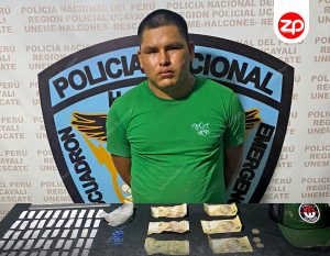 Cristian Rodriguez Pisco (22), fue detenido por la policía, cuando impunemente vendía envoltorios con droga a sus adictos clientes en presencia de sus vecinos de la calle Las Violetas, del AH Jardines de Manantay, distrito del mismo nombre.